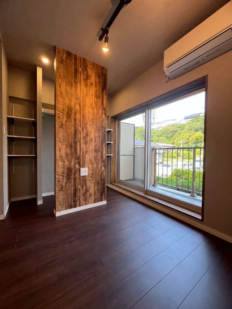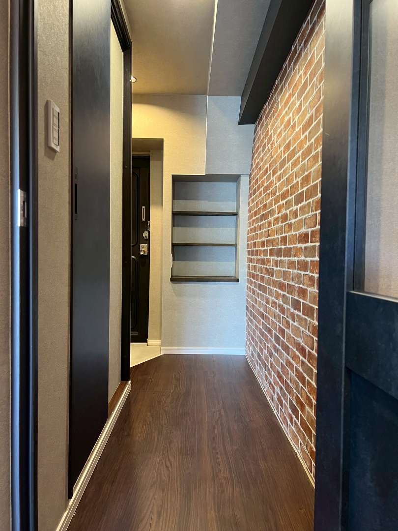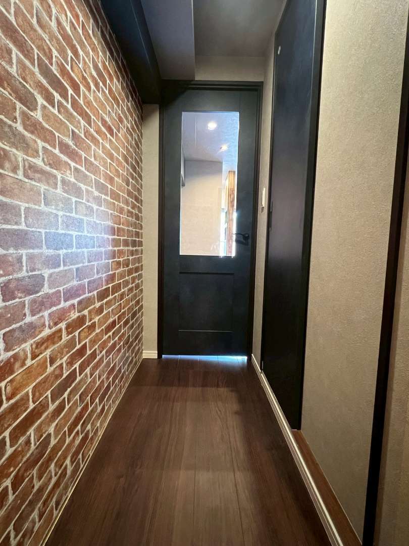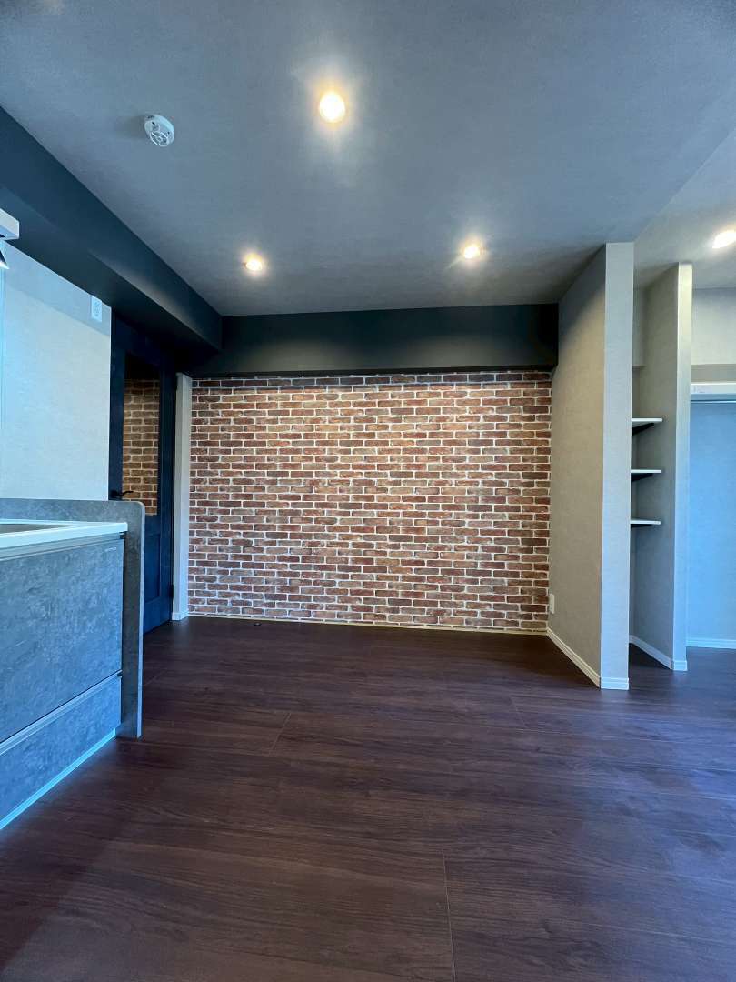 古木風木目壁、アンティークレンガ調の壁、ウォールナット色のフローリング、