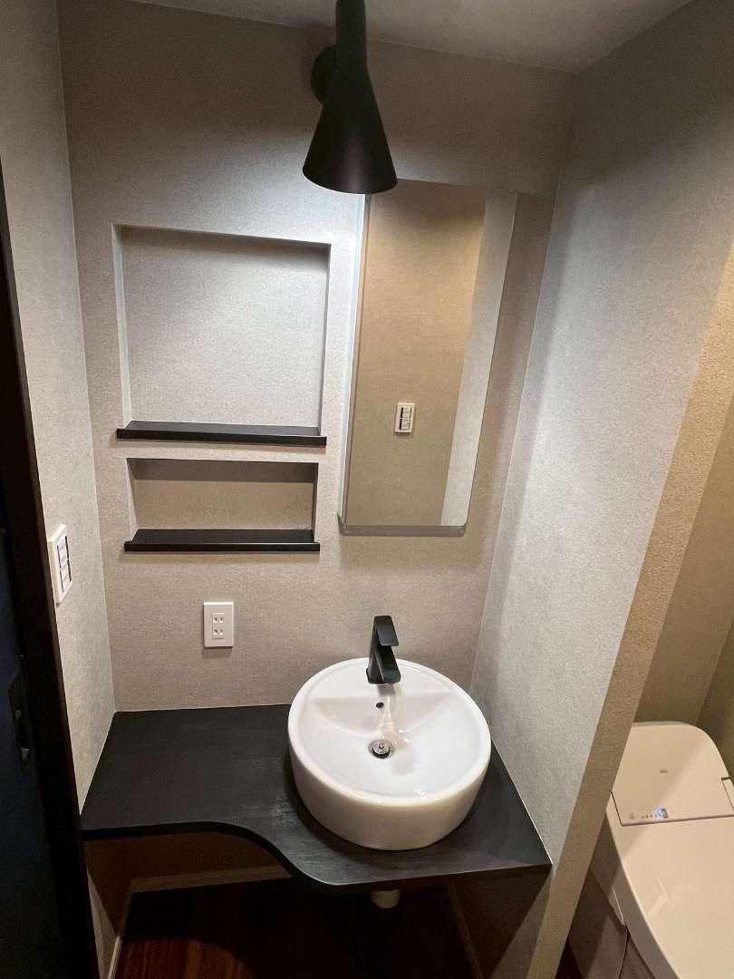 単体ボウル、ブラックのシングルレバー水栓、ニッチ棚、埋め込み収納ミラー等、デザイン性と収納力にもこだわっています。