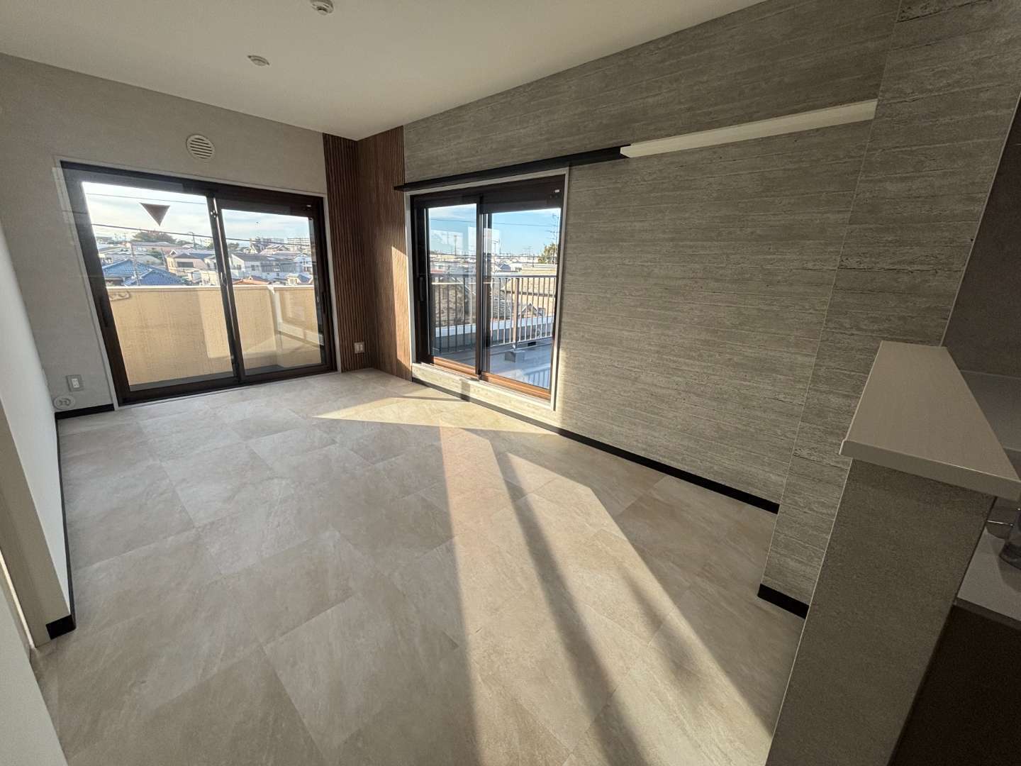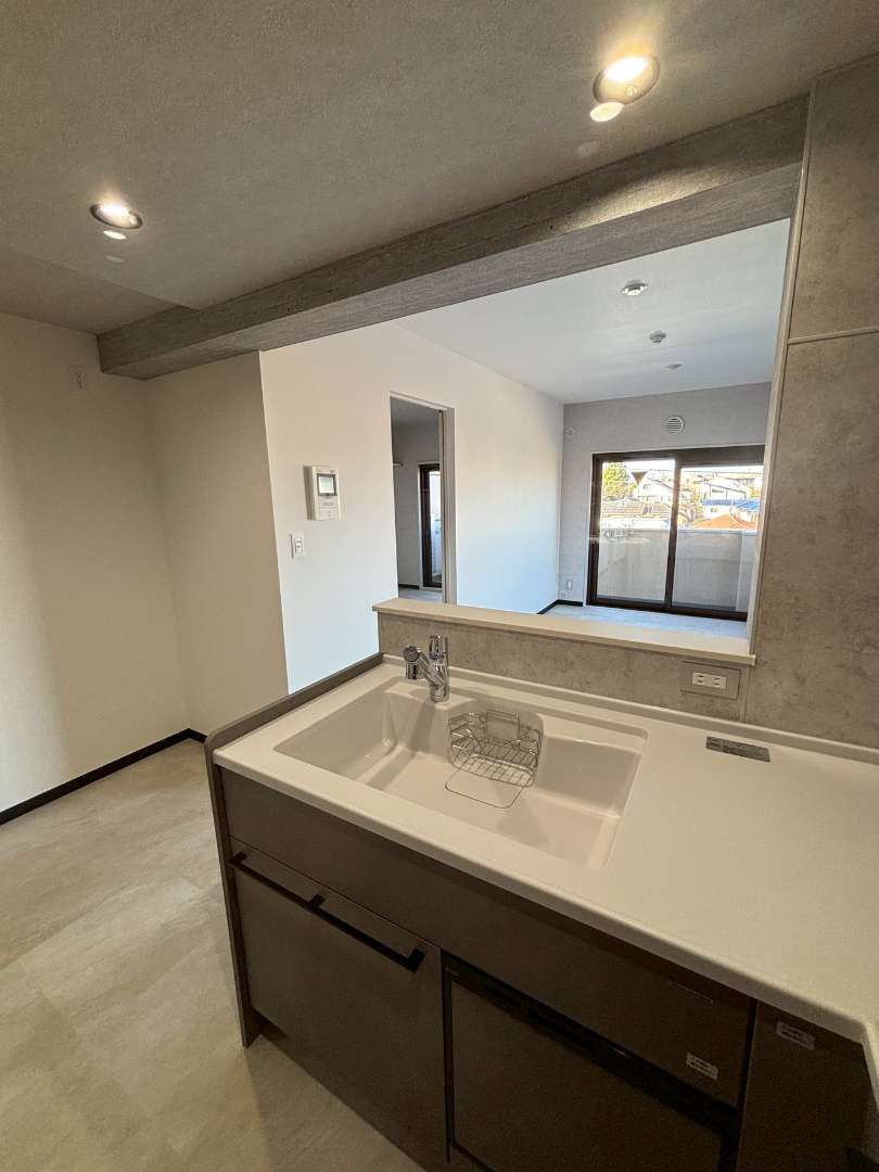 キッチンをL型対面にし、かつリビングを広げる為に洋室との境の壁をずらしています。